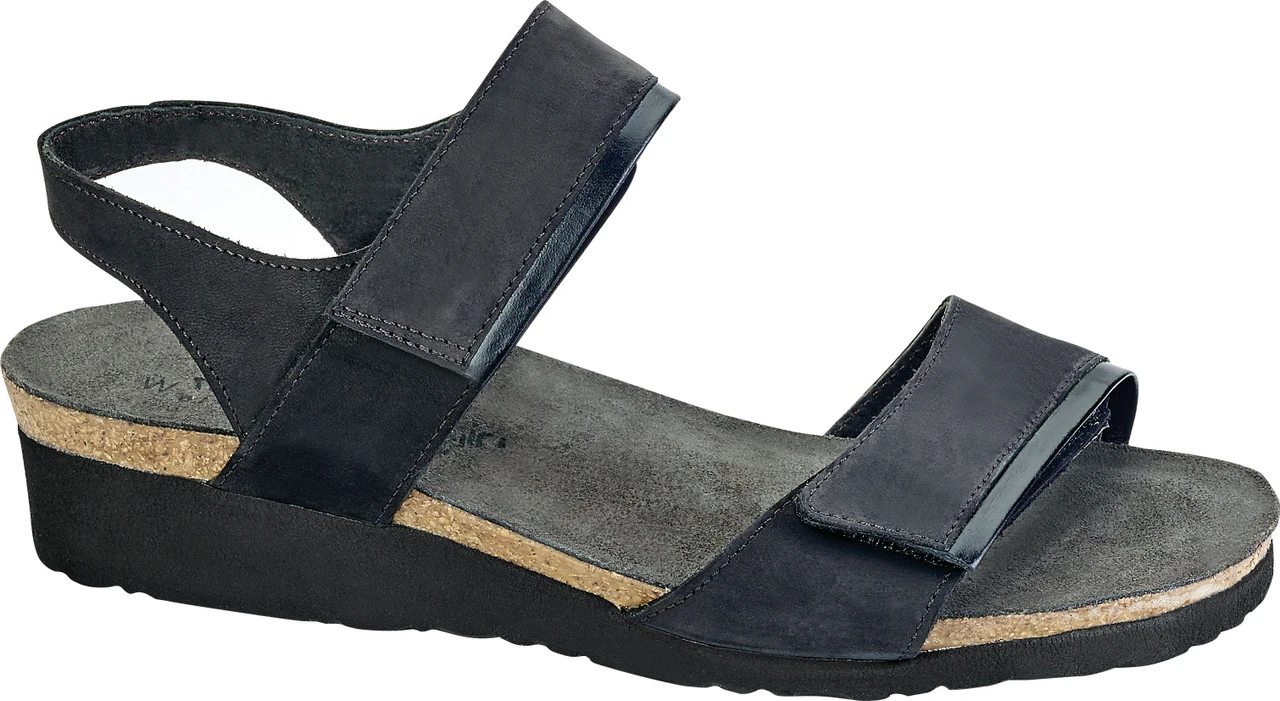 Englin’s Fine Footwear presents the women’s ‘Aisha’ from Naot. A contrasting leather detail on both straps the Aisha has the perfect edgy flare. Hook and loop straps couple with this feature to make the shoe a comfortable must have. The full coverage design offers ultimate support. Naot’s anatomic cork & latex footbed is wrapped in a pampering suede and molds to the shape of the foot with wear.