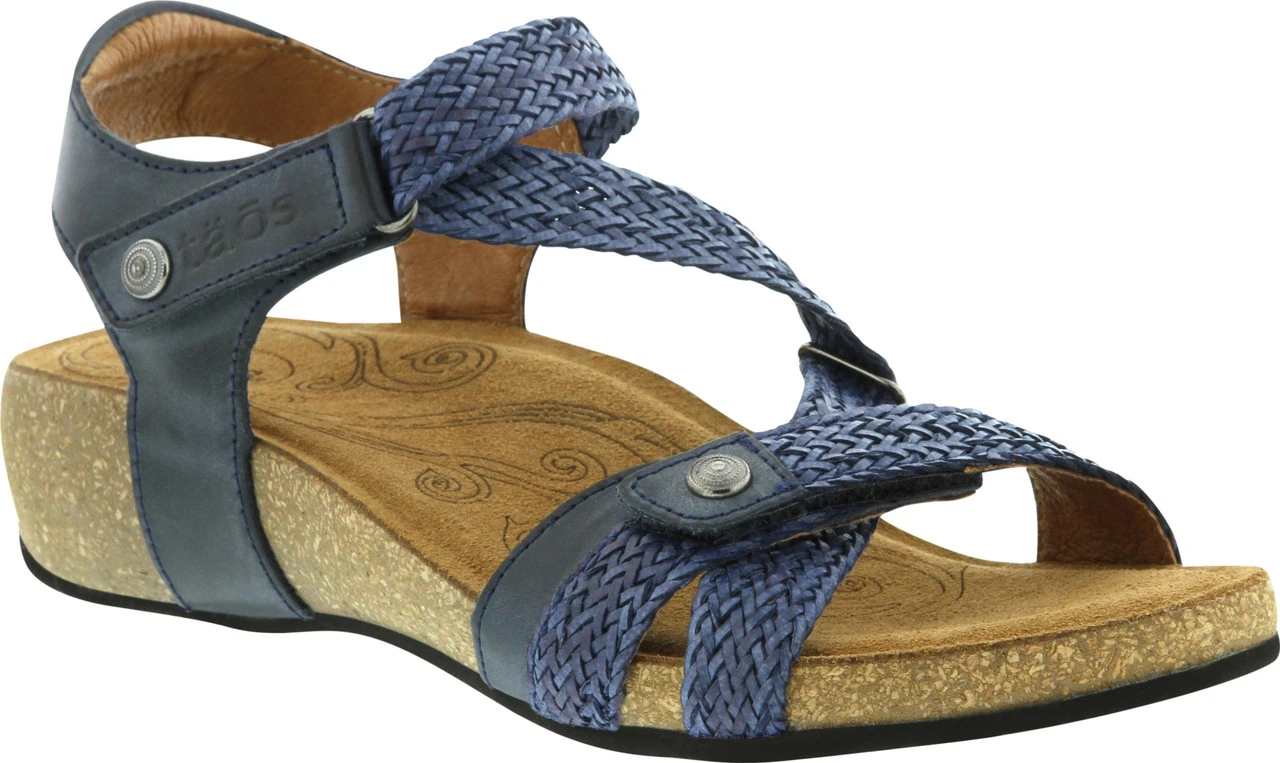 Englin’s Fine Footwear presents the women’s ‘Trulie’ from Taos. A truly scrumptious leather sandal made in Spain. Trulie comes in the colors of the Spanish sea, sky and earth. Man made woven hook and loop straps provide a custom feeling fit. Incredible comfort comes from the lightweight, padded, contour cork-polyurethane footbed lined in suede.
